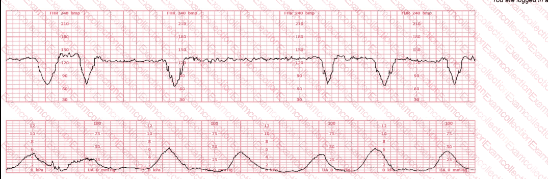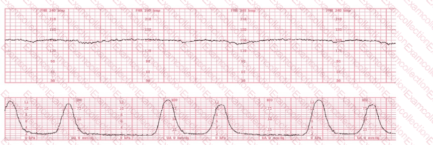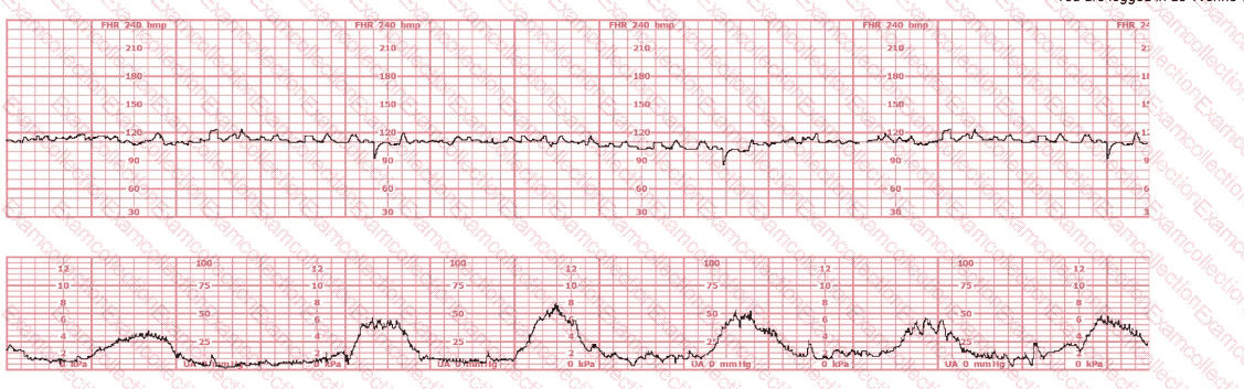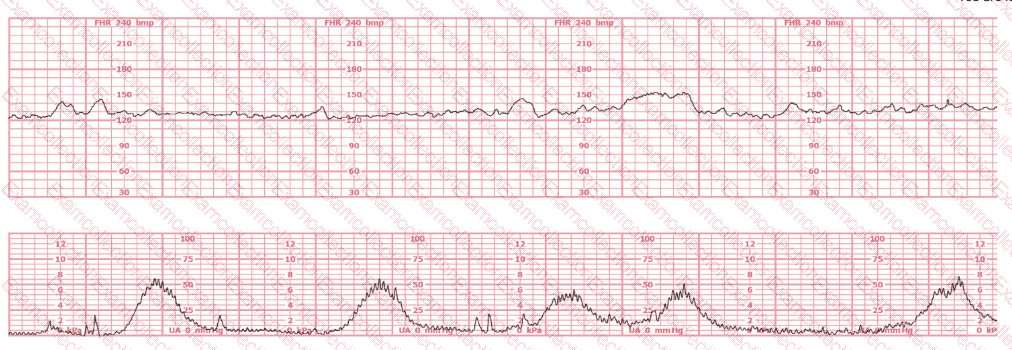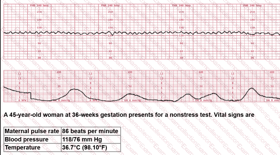 A 45-year-old woman at 36-weeks gestation presents for a nonstress test. Vital signs are: