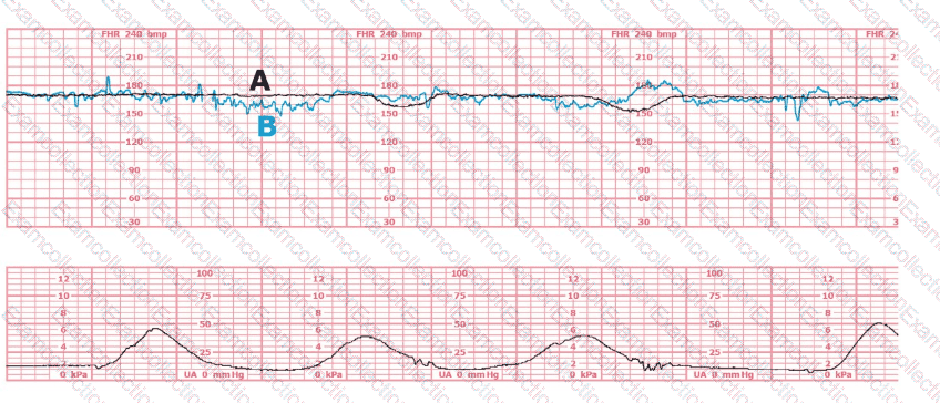 A 30-year-old woman (G2P0) is experiencing preterm labor at 26-weeks gestation. She is receiving magnesium sulfate for neuroprotection. Her external fetal monitoring tracing over the past 30 minutes is shown. The next step would be to: