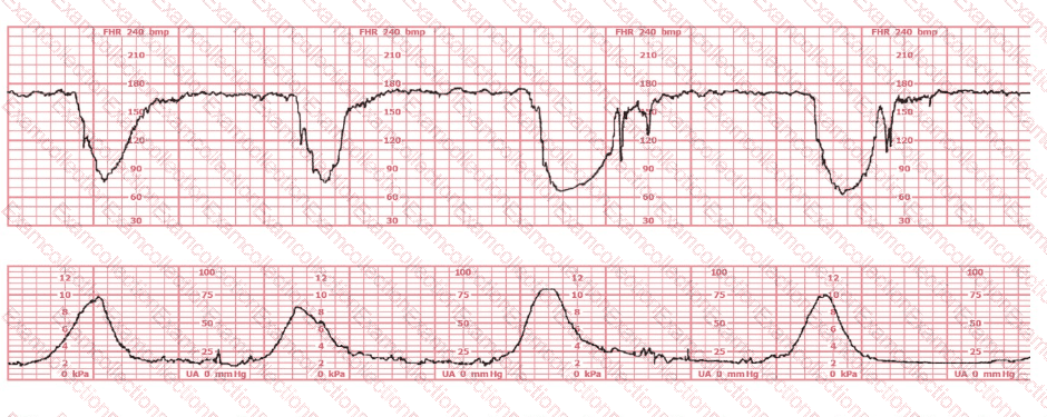 After spontaneous rupture of membranes, this fetal heart rate pattern is observed. The initial intervention should be to: