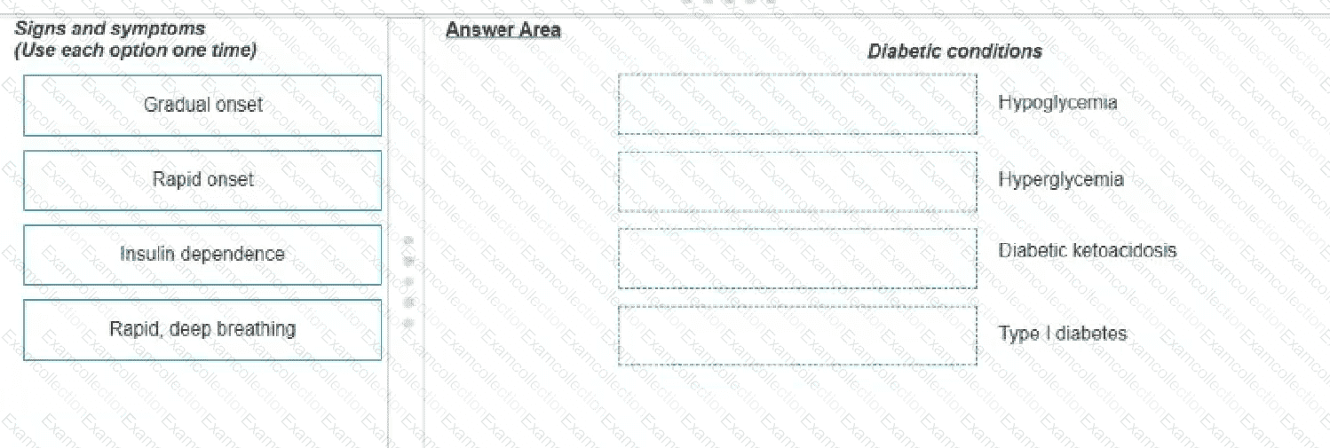 Which of the following signs or symptoms would be most closely associated with each of these diabetic conditions? Move each sign or symptom into the Answer Area one time to indicate the most closely associated diabetic condition.