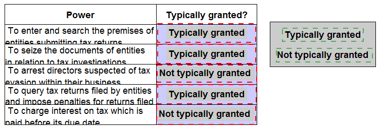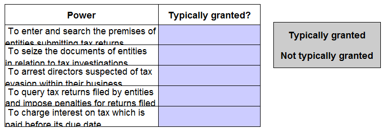Identify which of the following are powers that a government would typically grant it's tax authority by placing the appropriate response beside each power.