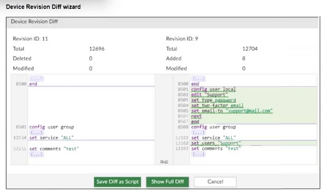 The administrator reverted the configuration using theConfiguration Revision Historywindow and received the CLI output shown in the exhibit.