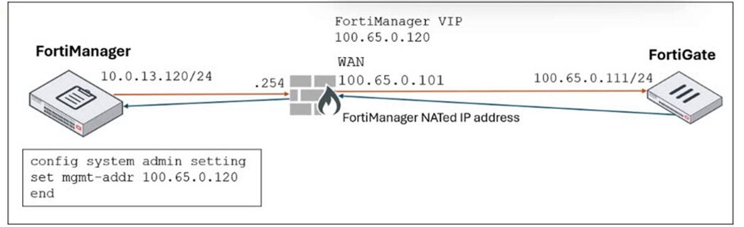 FortiManager is operating behind a network address translation (NAT) device, and the administrator configured the FortiManager NATed IP address under the FortiManager system administration settings.