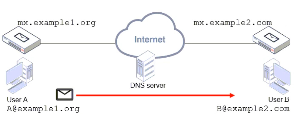 Which two statements correctly describe how an email message is delivered from User A to User B? (Choose two.)