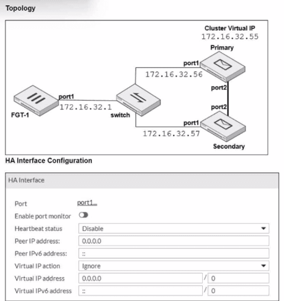 The exhibits display a topologydiagram of a FortiMail cluster (Topology) and the primary HA interface configuration of the Primary FortiMail (HA Interface Configuration)