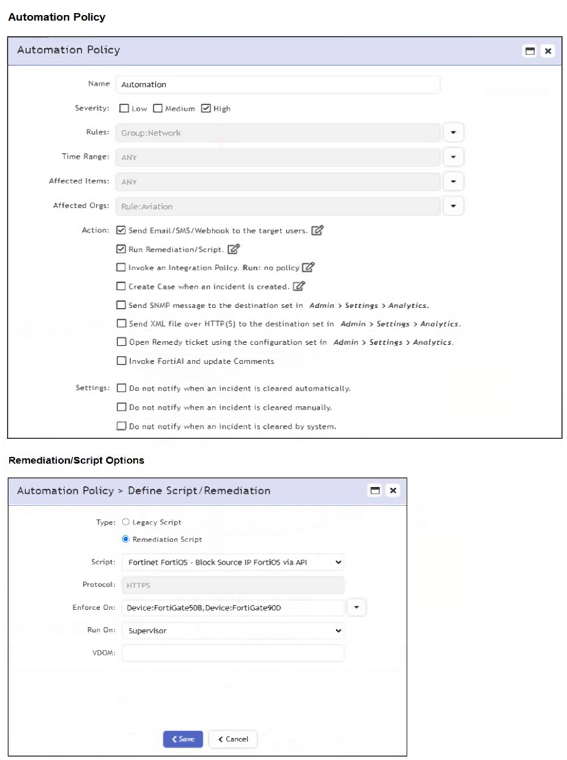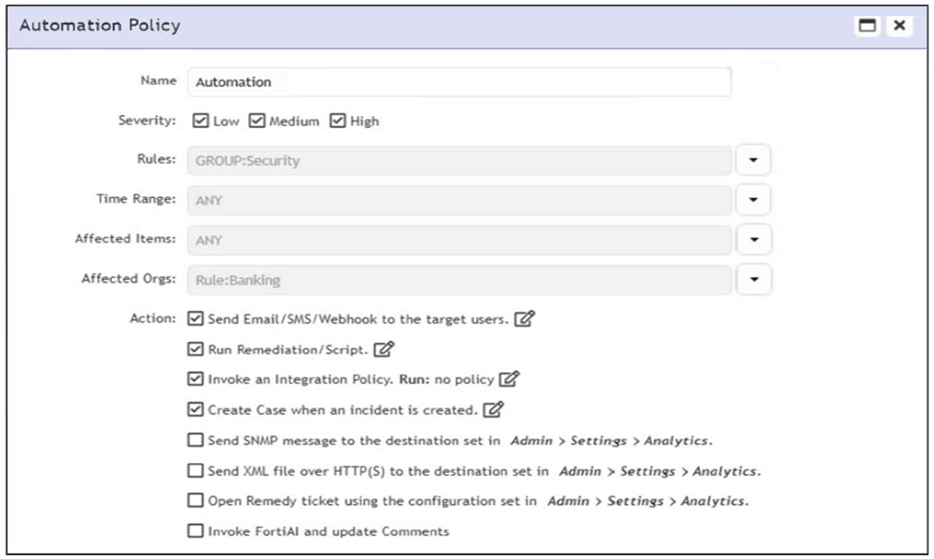 If a rule containing the automation policy shown in the exhibit triggers, what will happen?