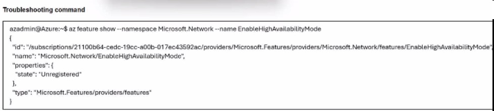 A managed security service provider (MSSP) administration team is trying to deploy a new HA cluster in Azure to filter traffic to and from a client that is also using Azure. However, every deployment attempt fails, and only some of the resources are deployed successfully. While troubleshooting this issue, the team runs the command shown in the exhibit.