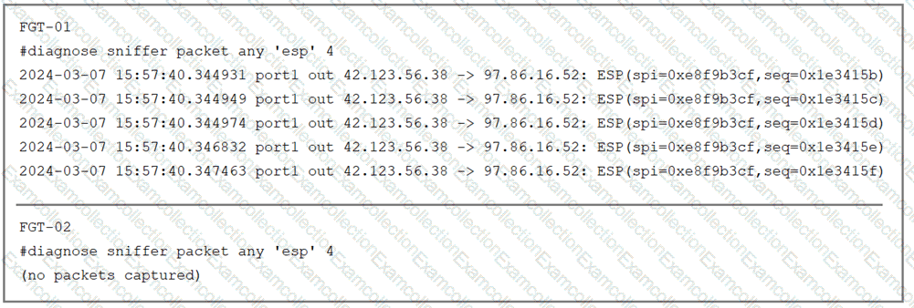 The sniffer log on two FortiGate devices are shown. Based on the information in the log, which two factors explain the output on FortiGate FGT-02? (Choose two answers)