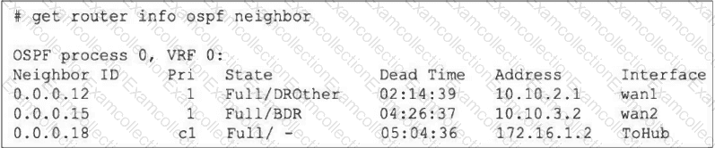Refer to the exhibit, which shows the output of the command get router info ospf neighbor.
