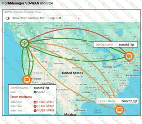 (You are using the FortiManager SD-WAN monitor menus to check the status of an SD-WAN topology. When you place the mouse next to branch1_fgt, you receive the output shown in the exhibit.