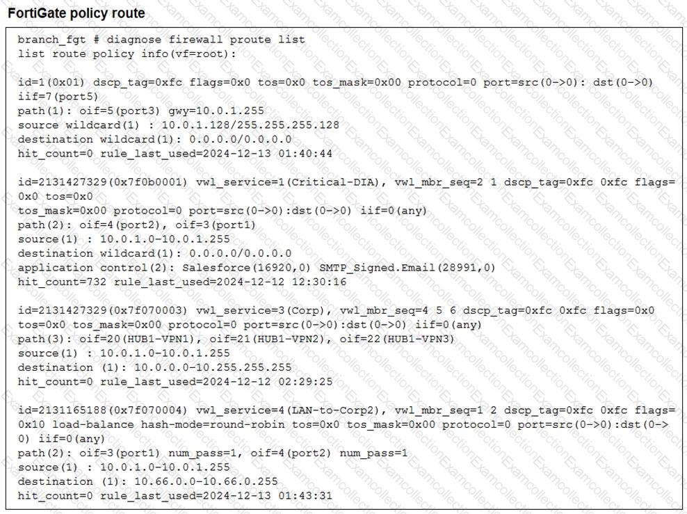 Based on the exhibits, which interface uses branch 1_fgt to steer the test traffic?