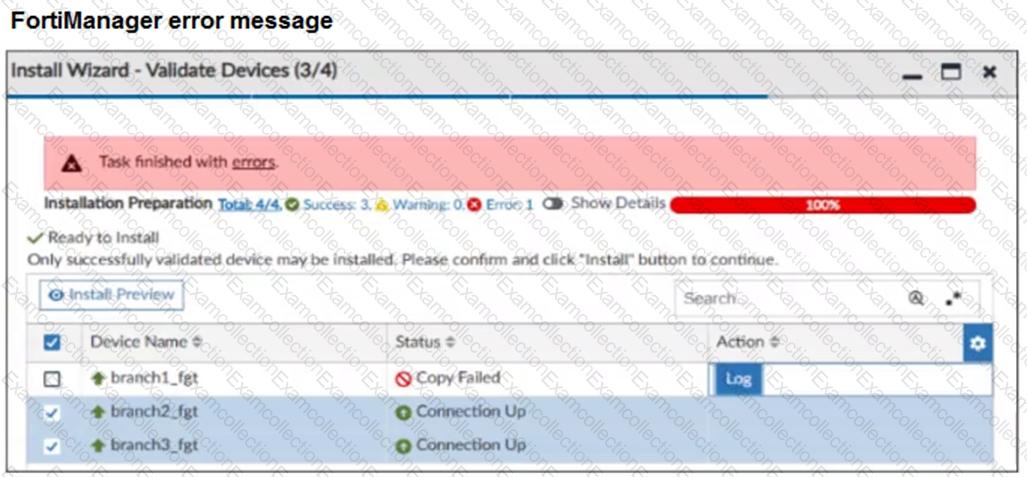 When you install the device settings, FortiManager prompts you with the error “Copy Failed†for the device branch1_fgt. When you click the log button, FortiManager displays the message shown in the exhibit.