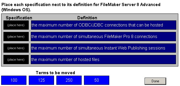 Place each specification next to its definition for FileMaker Server 8 Advanced (Windows OS).