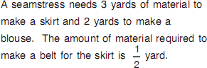The seamstress made 2 complete outfits that include a blouse, skirt, and belt. How many yards of material were needed to make these outfits?