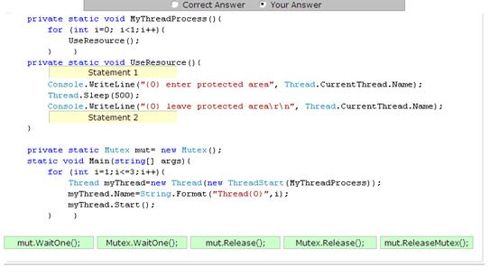 As you can see in the above code window, all the three threads enter the protected area at the same time. Drag and drop the appropriate statements that will allow the threads to enter the protected area one by one.