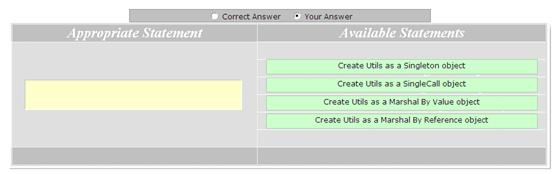 You work as a Software Developer for ABC Inc. You create an application, and you want to define a component for your application. In some deployments, the component will be deployed on the same computer as the application. In other deployments the component will be deployed on a separate computer. You create a Web service. You want a new object of the Web service to be created whenever a customer makes a call to the Web service. Drag and drop the appropriate statement to accomplish the task.