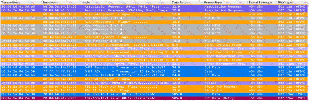 A customer is reporting mat connectivity is Tailing for some wireless client Devices. What are your conclusions from the capture? (Select two.)