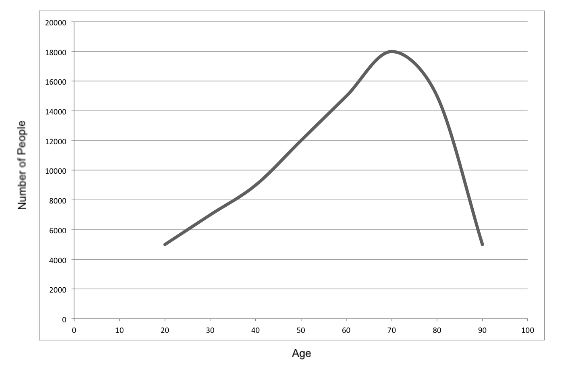 The graph shows the frequency distribution of the age of people with a certain kind of insurance contract.