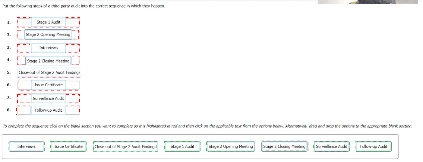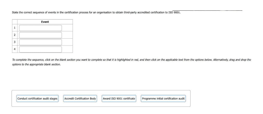 State the correct sequence of events in the certification process for an organisation to obtain third-party accredited certification to ISO 9001.