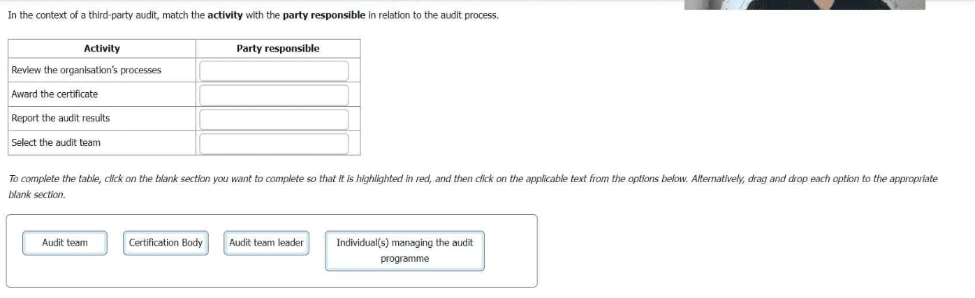 In the context of a third-party audit, match the activity with the party responsible in relation to the audit process.