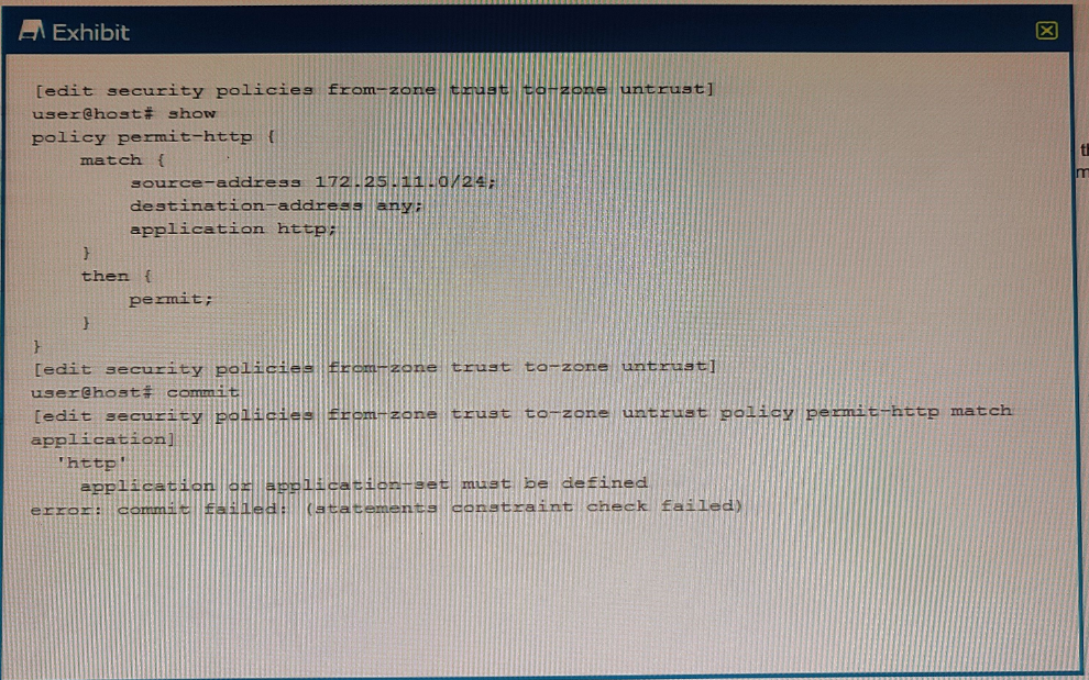 You are trying to create a security policy on your SRX Series device that permits HTTP traffic from your private 172 25.11.0/24 subnet to the Internet You create a policy named permit-http between the trust and untrust zones that permits HTTP traffic. When you issue a commit command to apply the configuration changes, the commit fails with the error shown in the exhibit.