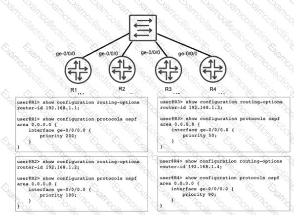 Referring to the exhibit, you have configured R1, R2, R3, and R4 to be a part of OSPF area 0 and you have connected them to a broadcast segment. Assuming all four routers come online within one minute of each other, which router becomes the DR and which router becomes the BDR?