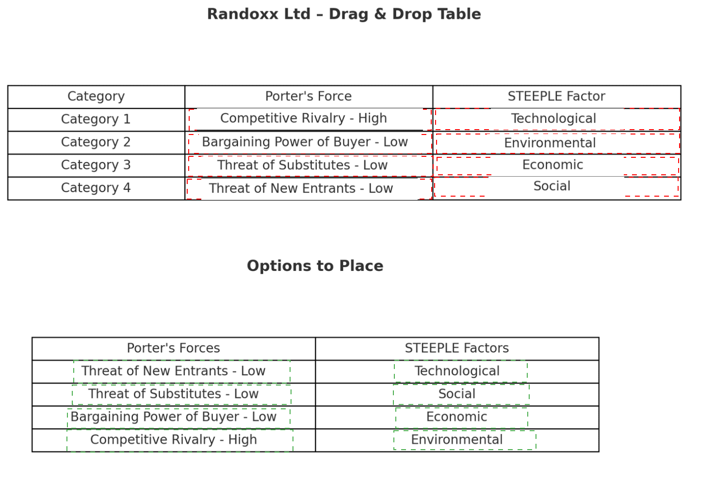 Complete the table below by identifying each category’s Porter’s Force driver and STEEPLE factor challenge. Each response should be used only once.