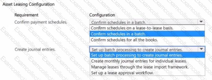 How should you configure asset leasing? To answer, select the appropriate options in the answer area.