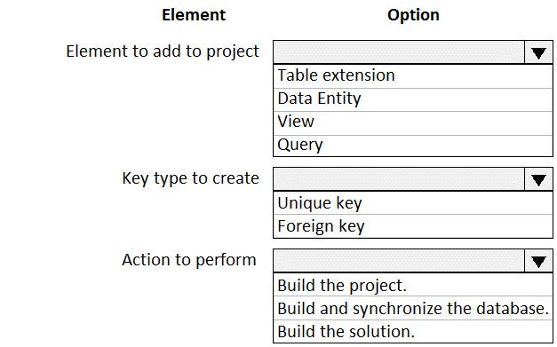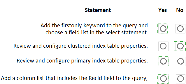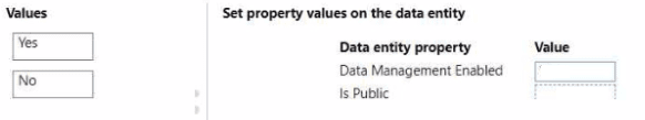 Which values should you set on the data entity properties? To answer, move the appropriate values to the correct data entity properties. You may use each value once, more than once, or not at all- You may need to move the split bar between panes or scroll to view content