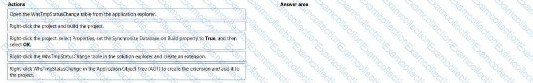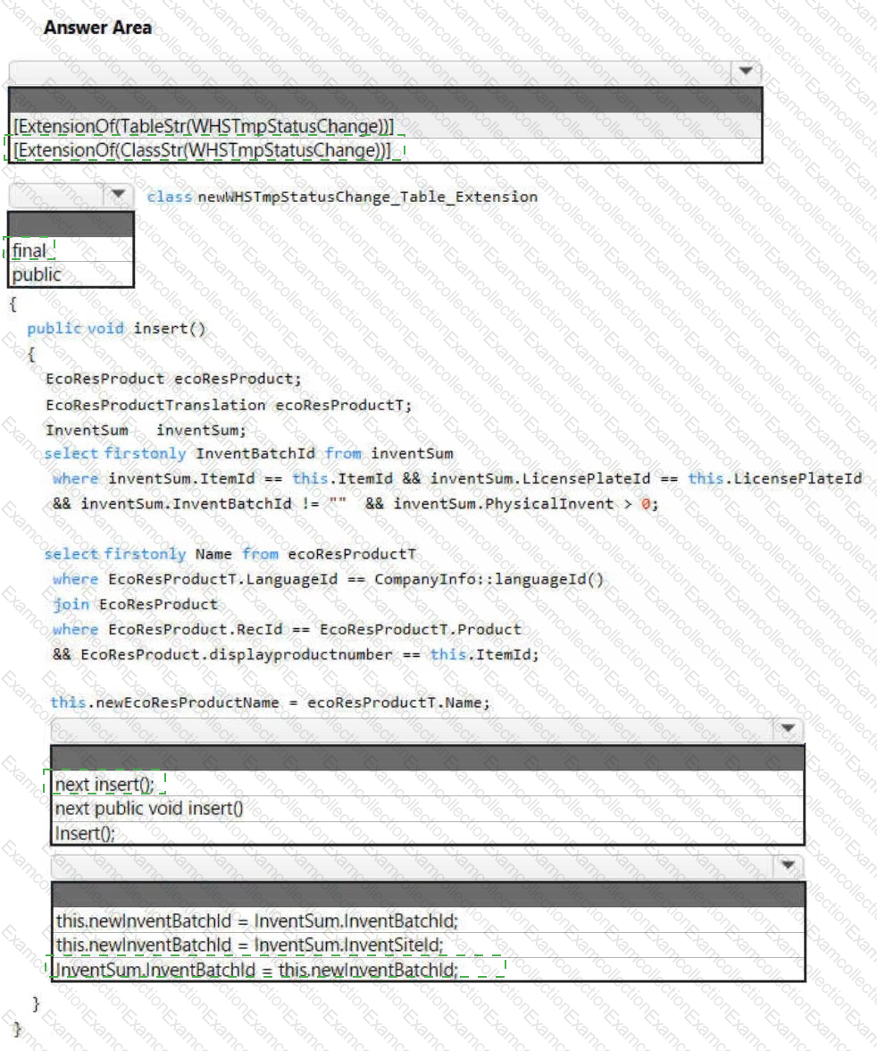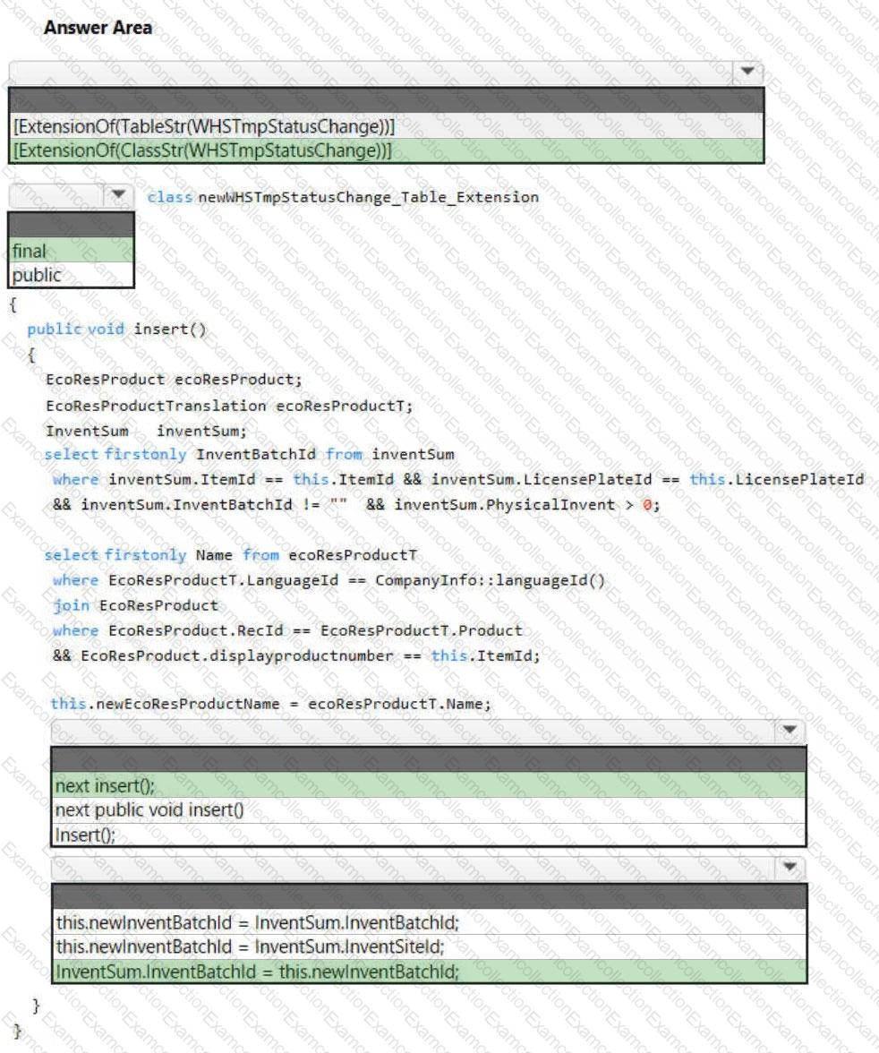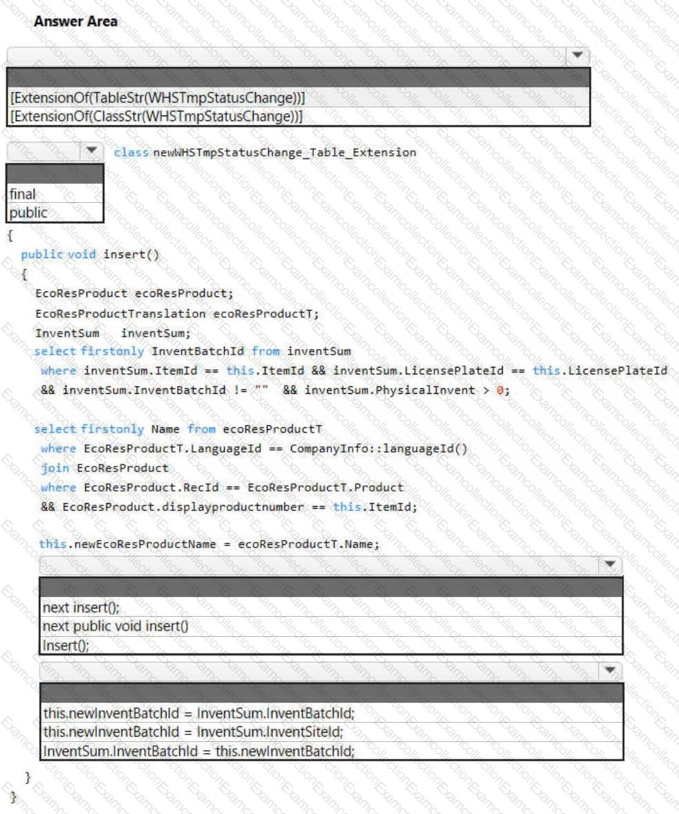 You need to create a chain of command method for inserting the data on the table for the new fields. How should you complete the code? To answer, select the appropriate configuration m the answer area. NOTE: Each correct selection is worth one point.