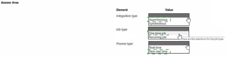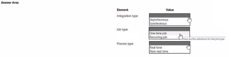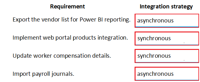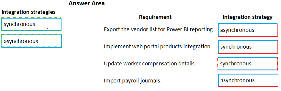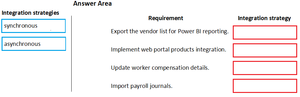 Which integration strategies should you use? To answer, drag the appropriate integration strategies to the correct requirements. Each integration strategy may be used once, more than once, or not at all. You may need to drag the split bar between panes or scroll to view content.