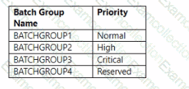A company is automating manual processes in the Dynamics 365 finance and operations apps. The company has the following batch groups and priorities configured: