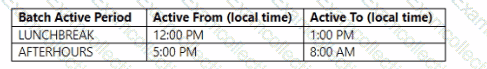 Solution: Create a batch job to have an active period of AFTERHOURS and a recurrence of Daily. Select the Every Weekday setting, and set the batch job to run as part of BATCHGROUP2.