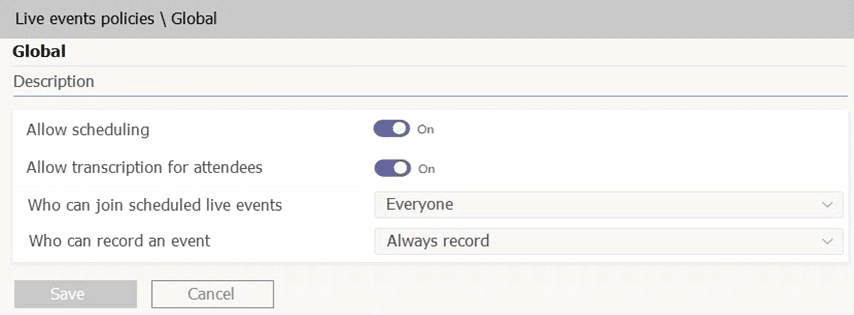 Contoso has a global live events policy configured as shown in the following exhibit.