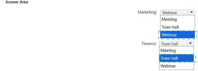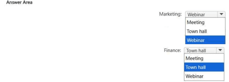 Which type of meeting should you recommend for each department? To answer, select the appropriate options in the answer area.