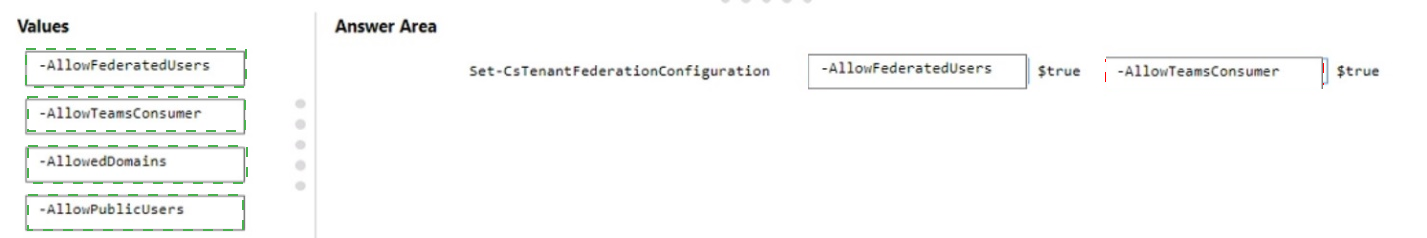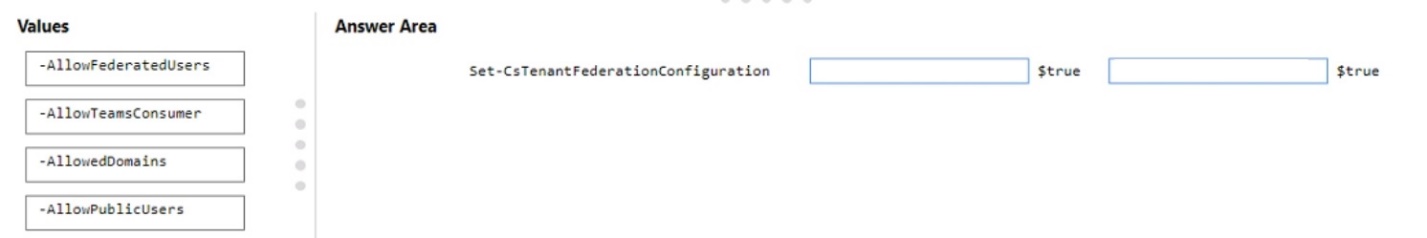 How should you complete the PowerShell cmdlets? To answer, drag the appropriate values to the correct targets. Each value may be used once, more than once, or not at all. You may need to drag the split bar between panes or scroll to view content.