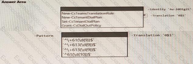 You need to ensure that numbers dialed from the Melbourne warehouse conform to the dialing rules of the phone earner. How should you complete the command? To answer, select the appropriate options in the answer area. NOTE: Each correct selection is worth one point.
