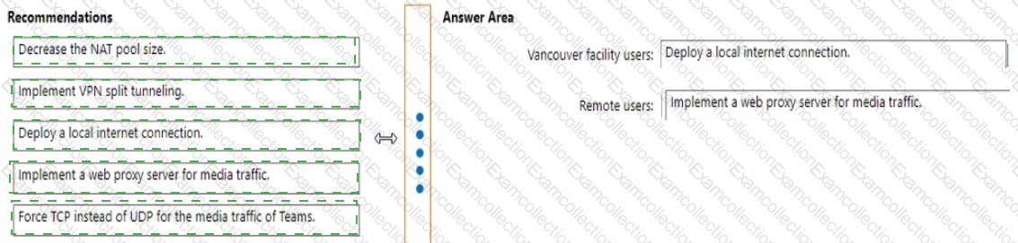 What should you recommend for the Vancouver facility users and the remote sale team users? To answer, drag the appropriate recommendation to the correct users. Each recommendation may be used once, more than once, or not at all. Vou may need to drag the split bar between panes or scroll to view content