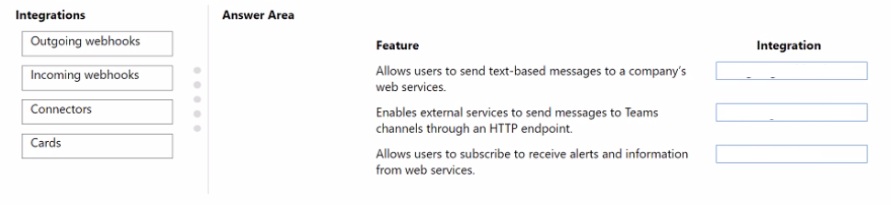 Which app integrations should you recommend' To answer, drag the appropriate integrations to the correct features. Each integration may be used once, more than once, or not at all. You may need to drag the split bar between panes or scroll to view content.