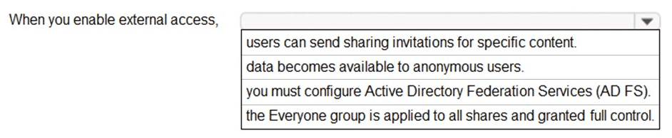 What happens when you enable external access by using the Microsoft 365 admin portal? To answer, select the appropriate options in the answer area.