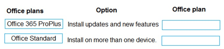Which Office plans should you use? To answer, drag theappropriate Office plans to the correct options. Each Office plan may be used once, more than once, or not at all. You may need to drag the split bar between panes or scroll to view content.