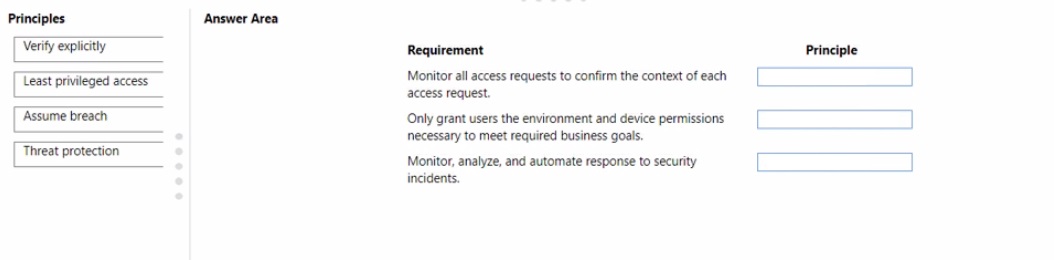 Which Zero Trust security principle should yourecommend? To answer, drag the appropriate principles to the correct requirements. Each principle may be used once, more than once, or not at all. You may need to drag the split bar between panes or scroll to view content