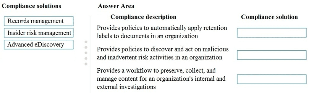 Match each compliance solution to its description. To answer, drag the appropriate compliance solution from the column on the left to its description on the right. Each compliance solution may be used once, more than once, or not at all.