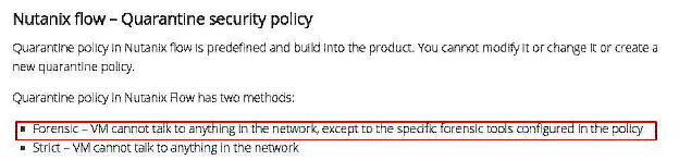 An administrator of a Nutanix Enterprise Cloud has microsegmentation enabled and a firewall VM installed. The security team notifies the administrator that one of the VMs hosted in the environment has been exhibiting suspect network activity. The administrator wants to isolate the VM from the production network, but must still be able to access it to perform diagnostics.