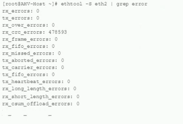 An administrator receives an alert in Prism indicating that interface eth2, on an AHV host is receiving many CRC errors. After togging into the problematic host, the following command is run to show the indicated output:
