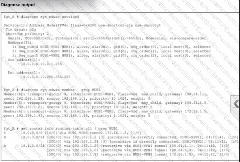 An administrator is troubleshooting SD-WAN on FortiGate. A device behind branch1_fgt generates traffic to the 10.0.0.0/8 network. The administrator expects the traffic to match SD-WAN rule ID 1 and be routed over HUB1-VPN1. However, the traffic is routed over HUB1-VPN3.
