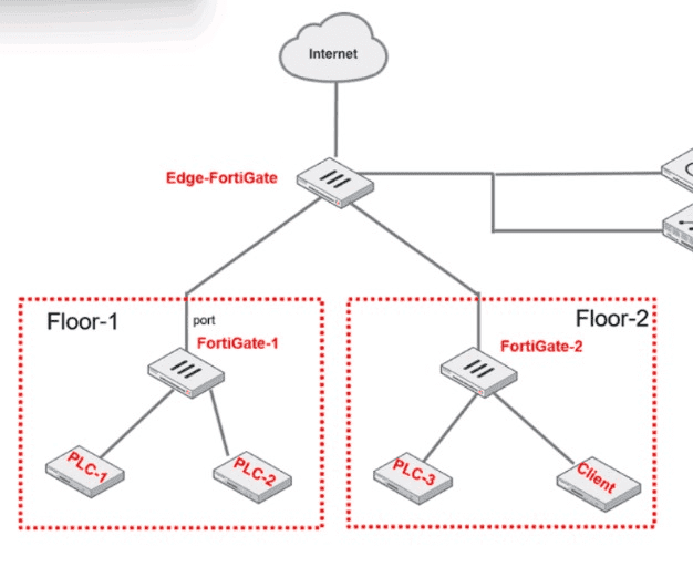 PLC-3 and CLIENT can send traffic to PLC-1 and PLC-2. FGT-2 has only one software switch (SSW-1) connecting both PLC-3 and CLIENT. PLC-3 and CLIENT can send traffic to each other at the Layer 2 level.