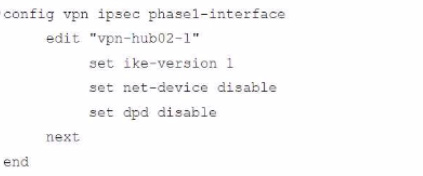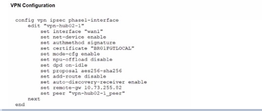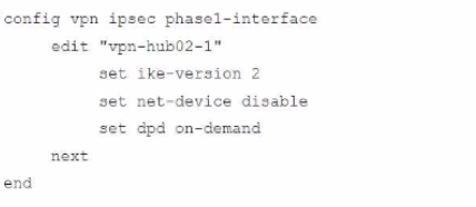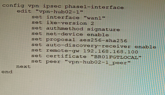 Which three commands must be added or changed to the FortiGate spoke config vpn ipsec phasei-interface options referenced in the exhibit for the VPN interface to enable this capability? (Choose three.)