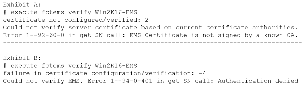 The exhibit shows two error messages from a FortiGate root Security Fabric device when you try to configure a new connection to a FortiClient EMS Server.