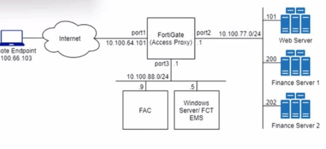 An HTTPS access proxy is configured to demonstrate its function as a reverse proxy on behalf of the web server it is protecting. It verifies user identity, device identity, and trust context, before granting access to the protected source. It is assumed that the FortiGate EMS fabric connector has already been successfully connected.